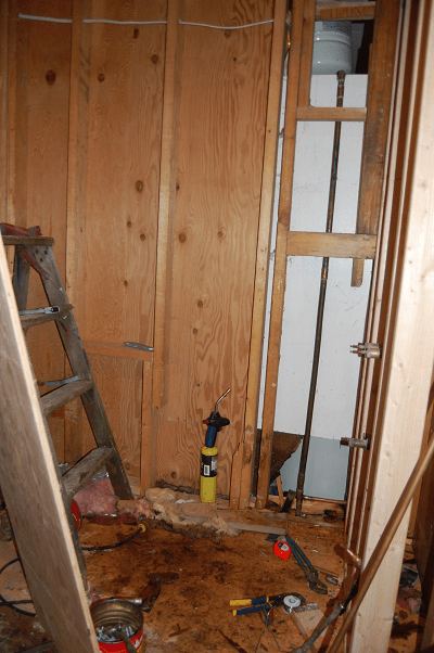 Anyways…this week, he decided to tear the bath tub out and take a look in there – it was a good thing he did, because there was a big hole in the ply-wood. Before the weekend we had something along these lines…