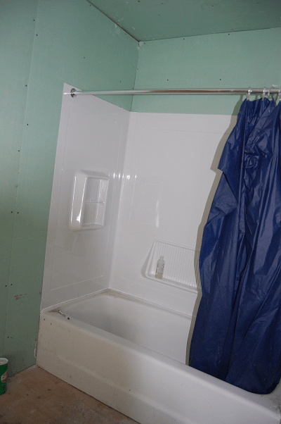 Its not completely finished yet, but as you can see the…Im not sure what you want to call it, the extra piece of “wall” that was built up infront is now gone. New drywall and tub surround kit. And its starting to feel / look like an actual bathroom…and the old smell is gone. It now smells outside in the pile of old floor/wall/rotten things.
