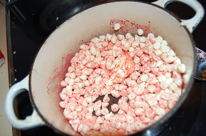 I found this recipe online. It looked simple. It looked easy. It looked like something I could do! It was only a few ingredients, looked cute, and off to work I set! Feeling especially bold I changed things up just a little. It calls for something called “Red melting disks” and after talking to a few “Baking fiends” I figured my idea would work! Why not just melt white chocolate and add red food dye? Thinking I was onto the next big idea I dumped an entire package of white chocolate chips into a pan. Added some butter – and turned the burner on. Then I squirted red food dye in. It looked like a vampire had attacked. Or I had cut my finger while chopping candy canes! As I stirred, I began to realize it was not working how I thought it would. It looked a little on the thick side. Thinking I needed something more “Liquid” like I added more butter. Quickly I had a ball of … nothing. A bright pink ball of chocolate.