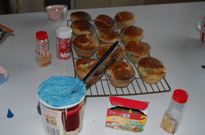 And then of course you have the attempt at dying frosting colors that dont turn out. And frosting with one hand while passing the baby back and forth. And getting frosting on him. And sticking a candle in a spare cupcake and taking it to someone who lives in the next room.