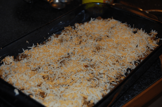 Pour meat mixture into oven safe dish, cover in cheese.