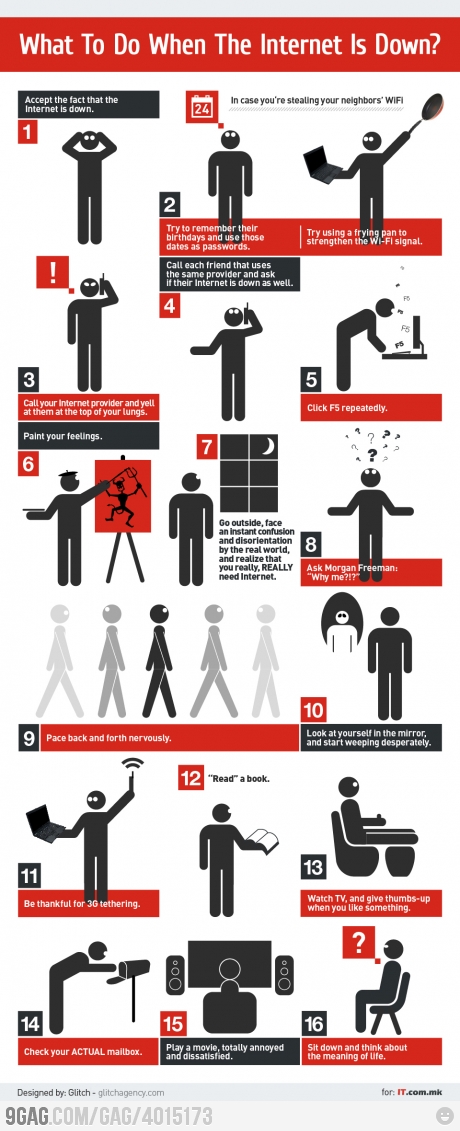This blog post is to commemorate my re-entrance to the world of the internet. The internet service went out here one week ago today, and just came back on last night. I couldn’t really be more excited. It’s amazing how much you miss the net when it’s gone, because when it’s gone, it seems everything is.