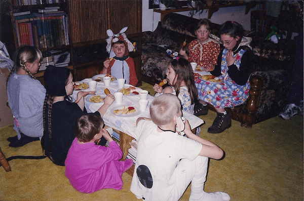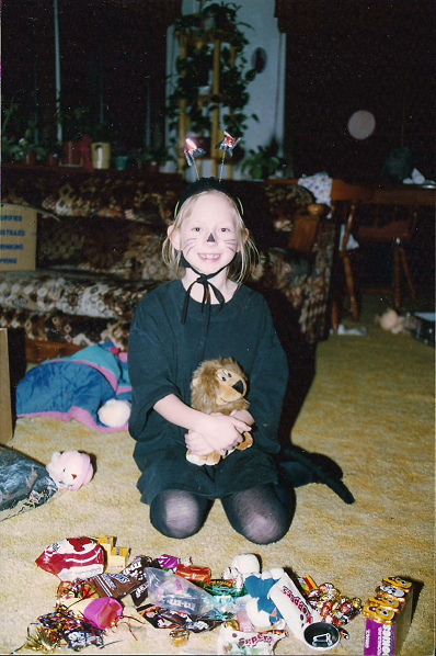 Wow that picture of us looks so funny, I never realized before that the ‘pilgrims’ were on the couch, and the ‘animals’ were on the floor. Haha I remember that day a bit actually! I think I was sad we didnt get to go trick or treating or something, I can’t remember, did we go that year? Loved that kitty outfit, lol! Makeup on the nose! I remember those candies too, I kept them in the freezer. 😀 Of course, you probably knew that right? You owe me!