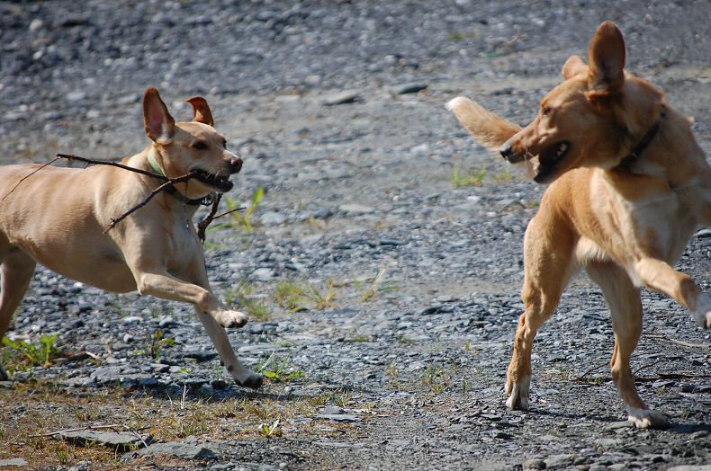 Such as when I looked out the window to see two blonde flashes go by on the back hill. Siren (who is skilled in running, climbing and dancing dangerously close to cliff edges) had somehow convinced Yoshi (who is not skilled in these areas) to go with her! It took her a bit longer to get down but I was happy to see she had went out and was playing.