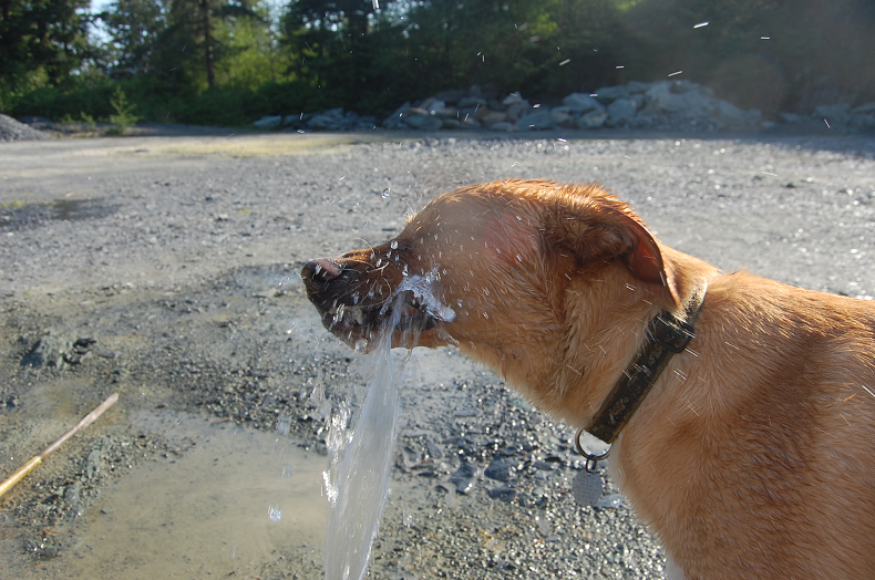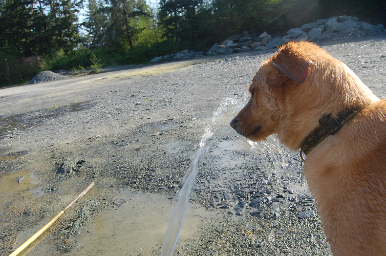 Tonight I was doing some burning and didn’t want the fire to get out of control so had the hose running. Since it has been dry for so long there aren’t any puddles around. Miss Siren loves her some puddles. She spotted to hose and went wild. I picked it up and this happened…