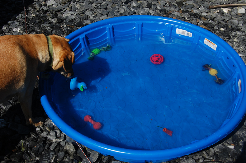 Last week we had a hot spell. We were dancing around high 80’s all week -and so I splurged and bought a $5 swimming pool and some plastic dollar toys to help keep the dogs cool (and keep the other dog from running off in seek of water -another story for another time.) Yoshi spotted the toys and was making herself comfortable with them, even doing her best to share when all of a sudden she started growling and snarling at the other dog.