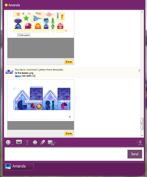 The other day while talking to Amanda across the internet –I stumbled upon Google who was, apparently, all decked out for the holidays as well…but the phrase? “Tis the season!” I found it funny so took a screen cap to send to Amanda –who at the very same time was taking a screen cap of Google over in England. We both sent the files to each other at the same time…