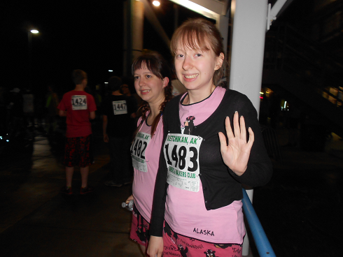 Rushing out to the car I spilled the news that the run was “THAT NIGHT” and “WE SHOULD SO GO!” Amanda was game. David on the other hand, could not understand why would want to wait up until midnight before running downtown in our pajamas…better yet, why would we pay for this with money?