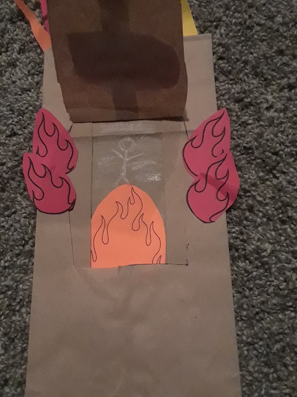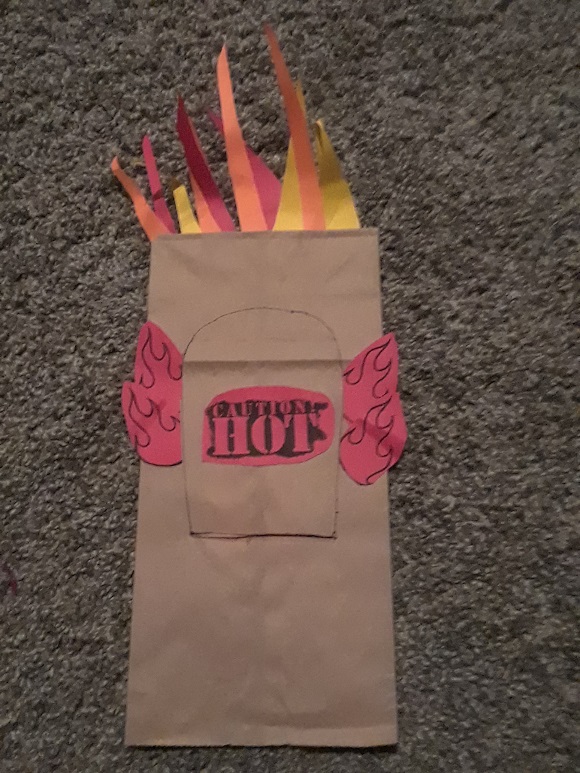 The fire was just some different flame outlines I found and printed up on different colored papers, and then some strips of colored paper on the top. A brown paper bag with a ‘furnace’ cut out on the middle. I left it so it could be a flap. The boy in my class that day appreciated the “Caution Hot” sign.