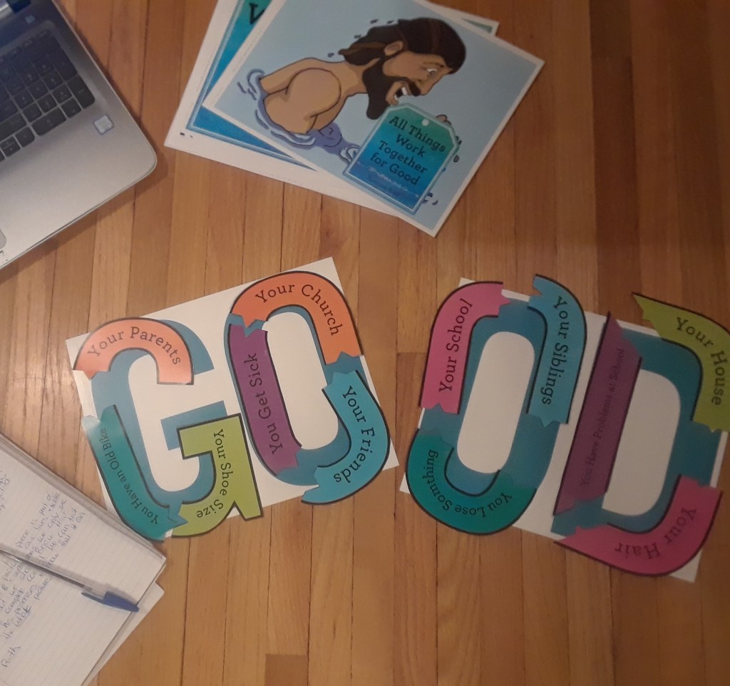 When the story was over –we looked over some things in our life that might not make sense to us now. Things like where we live, what church we go to, who our friends are….and then some not so good things like getting sick, moving away from our friends, having an old bike. We pieced the pieces together to spell out the word good –drawing from the inspiration that ALL things (not just some) work together for good.