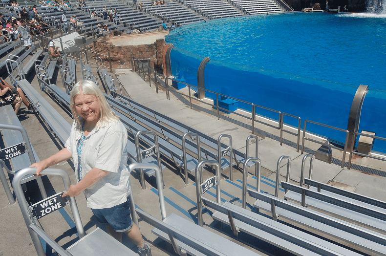 I got a little too excited and convinced mom to sit three rows from the front in the wet zone (spoiler alert: They aren’t kidding! It really is a wet zone!) I briefly panicked about the camera getting wet -considered buying a poncho (really? Sit in the wet zone and buy a poncho?) but then decided we would be ok.