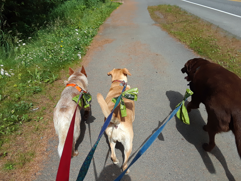 While that might not sound like much, each one of them has their own unique sets of fears / aggravations / excitement triggers. It pretty much looks like each dog is going his / her own way. Which means I am getting drug in three separate directions. At the same time.