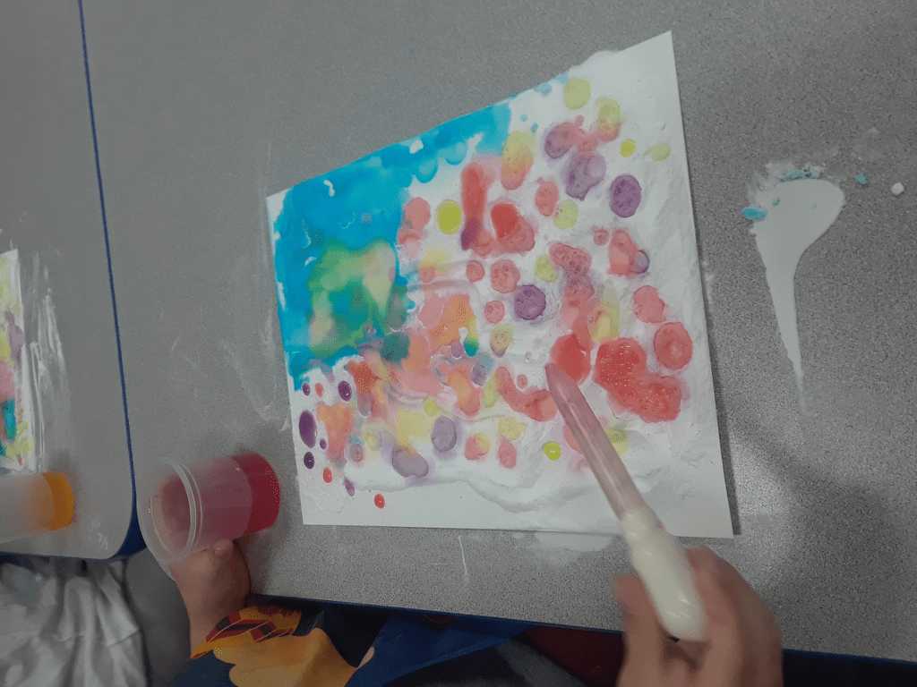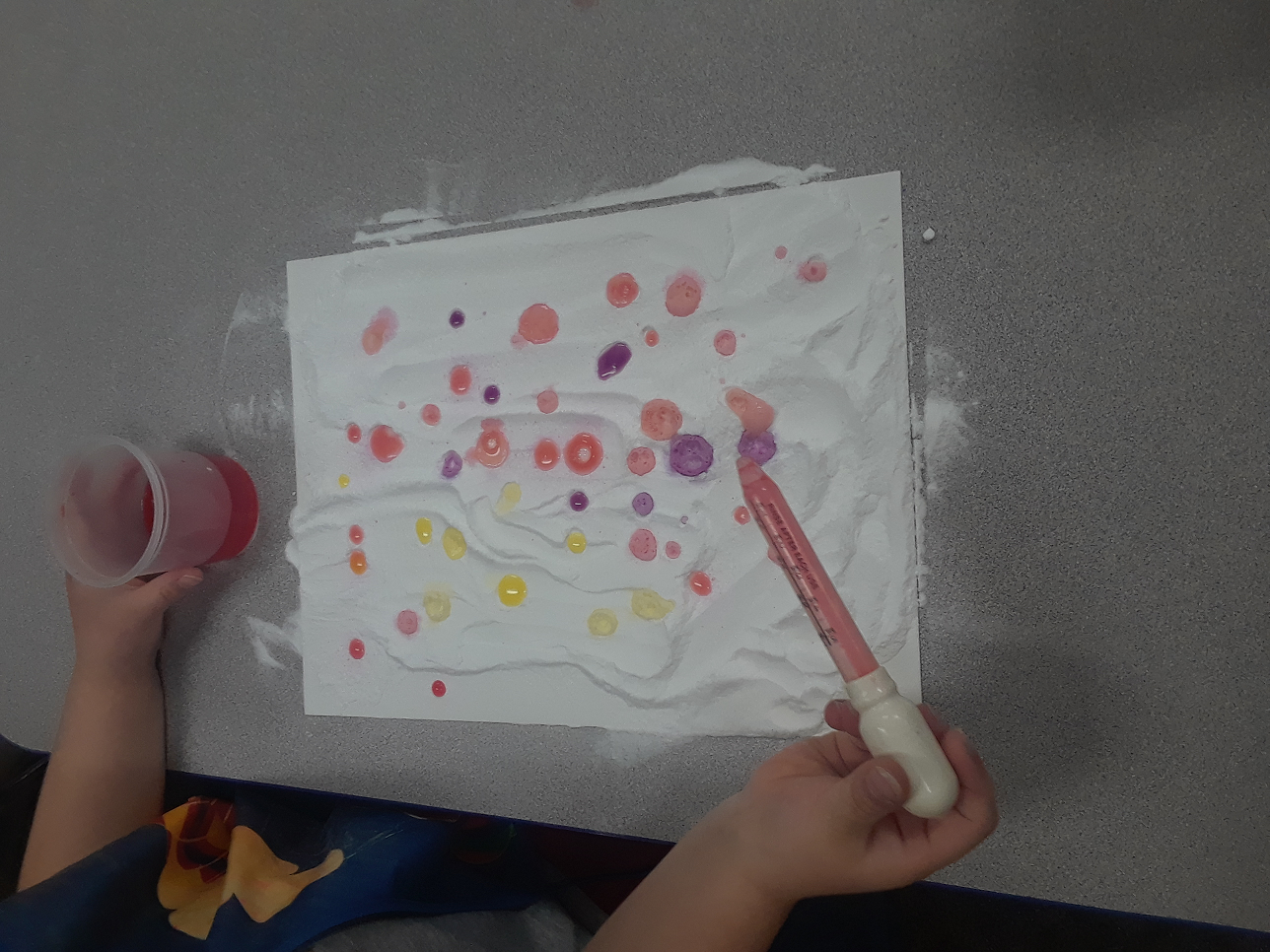 In short -you take some water color paper, cover it with baking soda, then use eyedroppers to drop vinegar (we added food coloring) onto it. The reaction creates a fizzy mixture that is cool to watch.