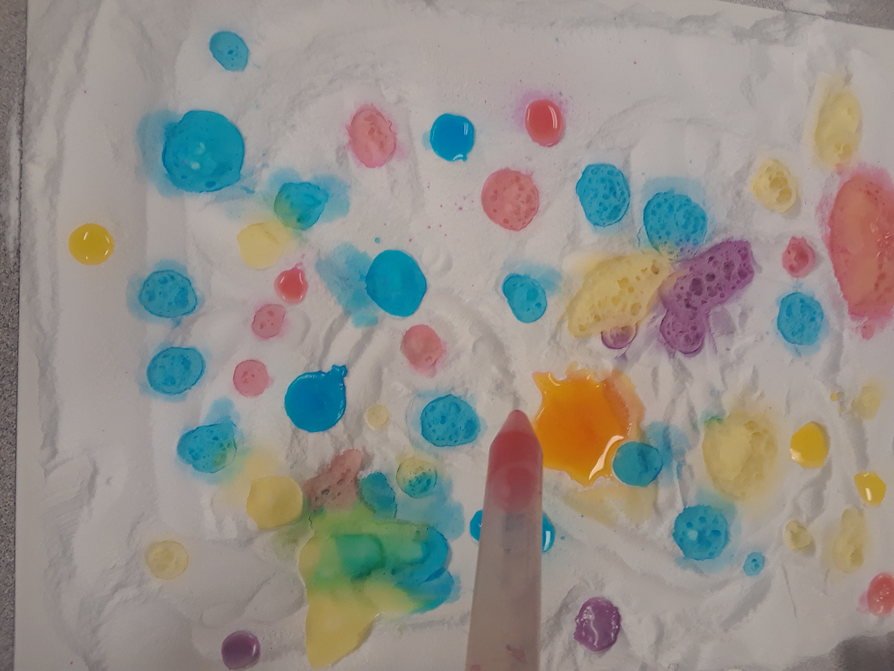 Today’s activity almost didn’t happen because apparently baking soda is a rare commodity these days -but I finally secured me a few boxes and went to work. I’ve seen it called different things but that general idea seems to be called “Fizzy paint”.