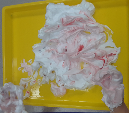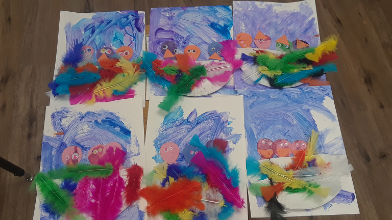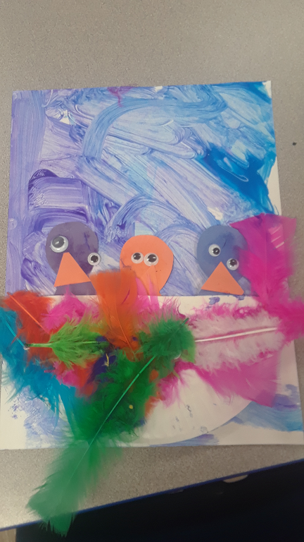 First we painted the background with some different colored blue paints. Then we glued down our ‘nest’ which was just 1/2 a paper plate. I gave them each four ‘birds’ with the beaks and eyes. I buy googly eyes in the bulk! Of course, I explained what each piece was and handed them out in stages, but some of them chose to do something a little different. Once the birds were safely in their nests, I pulled out the feathers and there was a mad rush of grabbing.